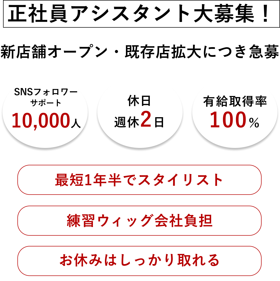 安定した給与にくわえて、技術・接客・売上づくりまで丁寧にサポート。「長く働けるサロン」を探している方に合う環境が整っています。